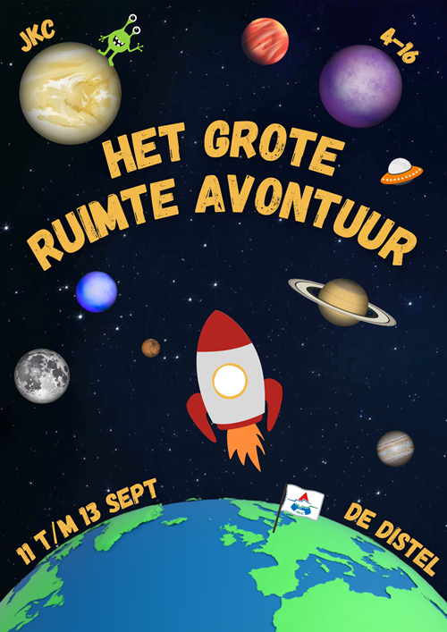 Beste ruimtevaarders, We zijn alweer aangekomen bij het laatste JKC weekend van dit seizoen. We zullen dit jaar afsluiten met een enorme knaller! Een spectaculair weekend voor de leeftijd 4 t/m 16 jaar. We gaan namelijk de ruimte in! Maar oh nee alarm! Het ruimteschip is vast komen te zitten in de ruimte. Alleen met hulp van echte avonturiers kunnen wij weer terug naar de aarde. Jullie kunnen ons helpen. Maar hoe? Tijdens dit weekend leren jullie hoe het is om een echte ruimtevaarder te worden. Het avontuur in de ruimte is nog onbekend…Maar toch hebben we al iets gehoord over de proeven die jullie gaan doorstaan. Volg de coördinaten, bouw de snelste raket, kruip in de huid van een wetenschapper en beleef de spannendste missies. Doorsta jij alle proeven om zo je ruimtediploma te halen! En kun jij Jille en Jelle spotten tussen de planeten! Accepteer jij deze super unieke uitnodiging om mee de ruimte in te gaan. Kom langs van 11 t/m 13 september bij het kampeerterrein Zeewolde en wordt een echte astronaut. Ben je er klaar voor? Schrijf je dan nu snel in!