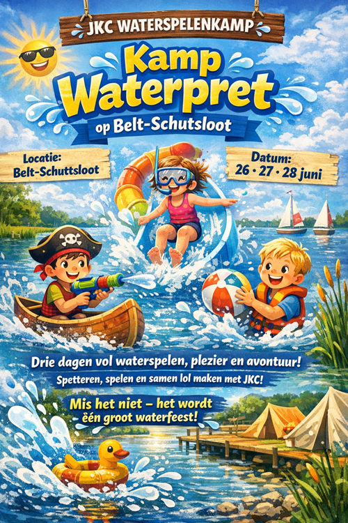 Beste Waterratten, Pak je zwemkleding en je goede humeur, want het is weer tijd voor het JKC Zomerkamp! Op 26, 27 en 28 juni gaan we naar Belt-Schutsloot voor drie dagen vol water, spellen en gezelligheid. Jullie kunnen veel waterpret en gezelligheid verwachten. Wat we precies gaan doen houden we nog even geheim… maar reken op veel lol, natte sokken en herinneringen waar je nog lang over napraat. Of je nou houdt van droge of natte kleren, rennen, plonzen of gewoon plezier maken met vrienden: dit kamp wil je niet missen. Er zullen leuke spellen zijn voor iedereen. Het wordt weer supergezellig! Neem vooral jullie vriendjes en vriendinnetjes mee, want hoe meer zielen, hoe meer vreugd. Let op: Zwemmen is op eigen risico.